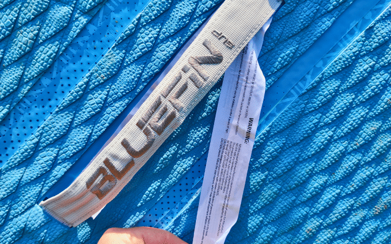 • 3 Carrying Loops: There is a handle at the rear, in the middle of the board, and on the side of the board tip. All 3 are made of webbing material embroidered with the Bluefin lettering and padded with neoprene. There are long flags with warm warnings under the central carrying strap, which I find unattractively placed, at least visually.