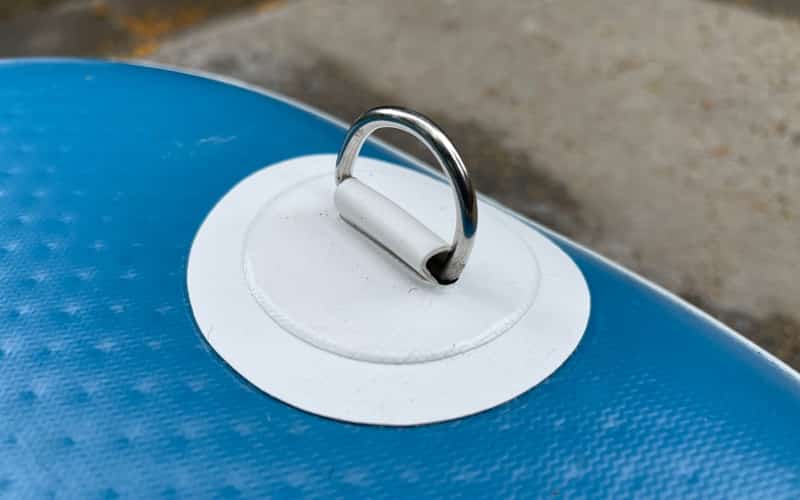 - 4 D-rings: A sturdy D-ring located behind the valve at the rear is used for attaching the provided coiled leash (spiral safety line). For attaching the provided carry strap, the board now features 2 smaller, side D-rings. Another one is located at the Action-Cam mount, where you can secure the board, for example, during a break.