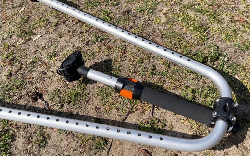 - Attach the Drawbar: Combine the two long pieces of the drawbar with the aluminum bracket, securing them with snap-lock connections at the shortest setting. Then, attach the assembled drawbar to the main frame using the same snap-lock system.